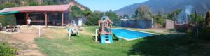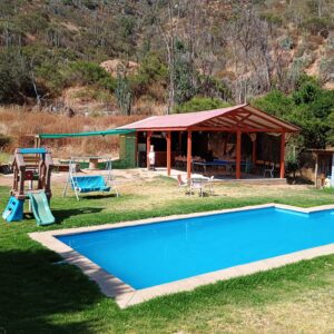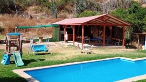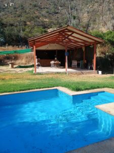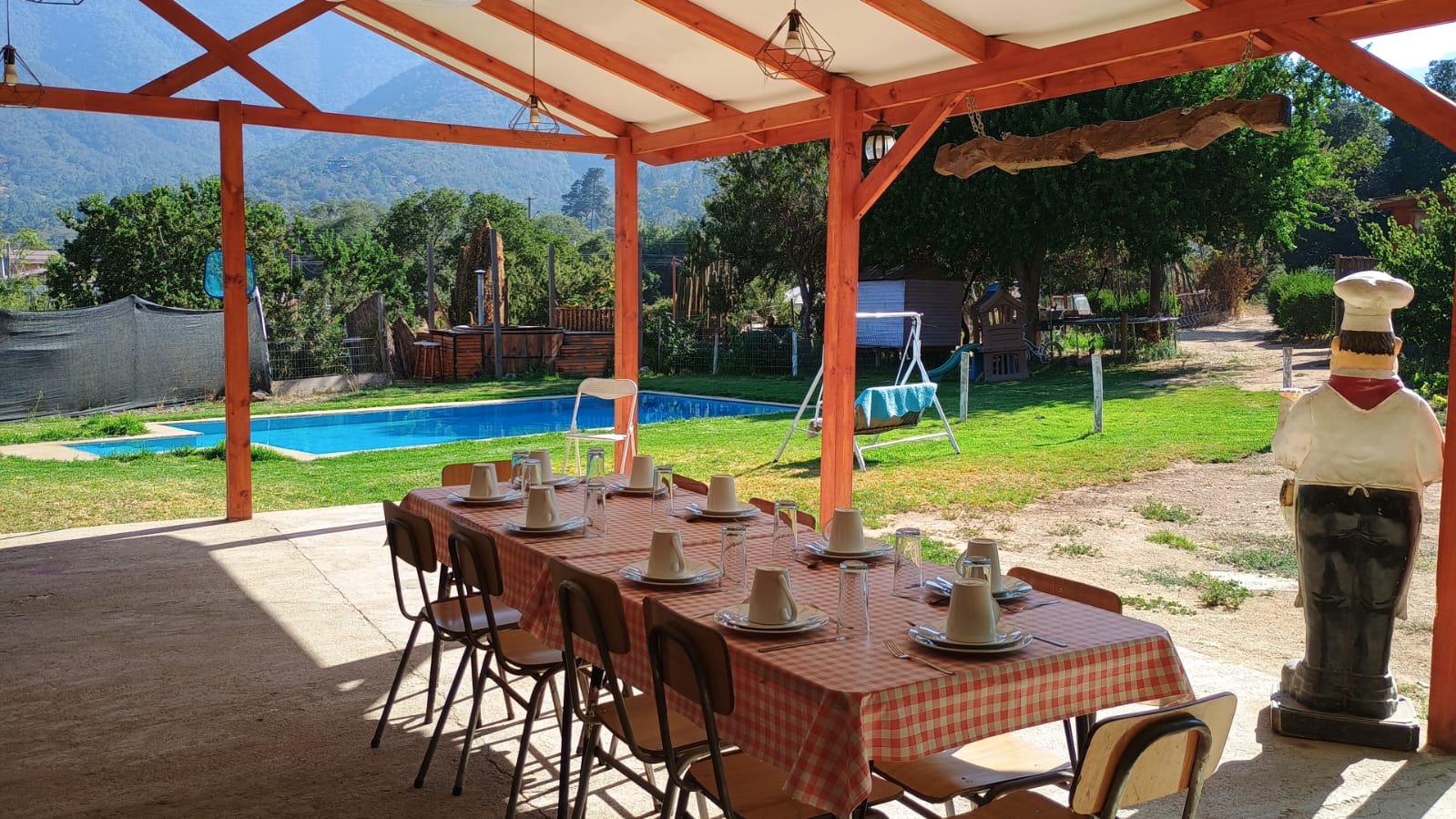Cabaña que está equipada para 8 personas pero con capacidad para un máximo de 12 personas, con una terraza donde se encuentra una parrilla para hacer asado y mesa para compartir en familia una piscina de 10 * 5 de 80 cm lo más bajo y 175 cm lo más hondo.