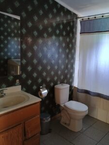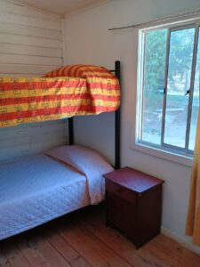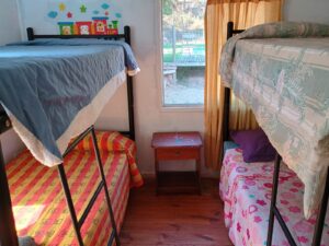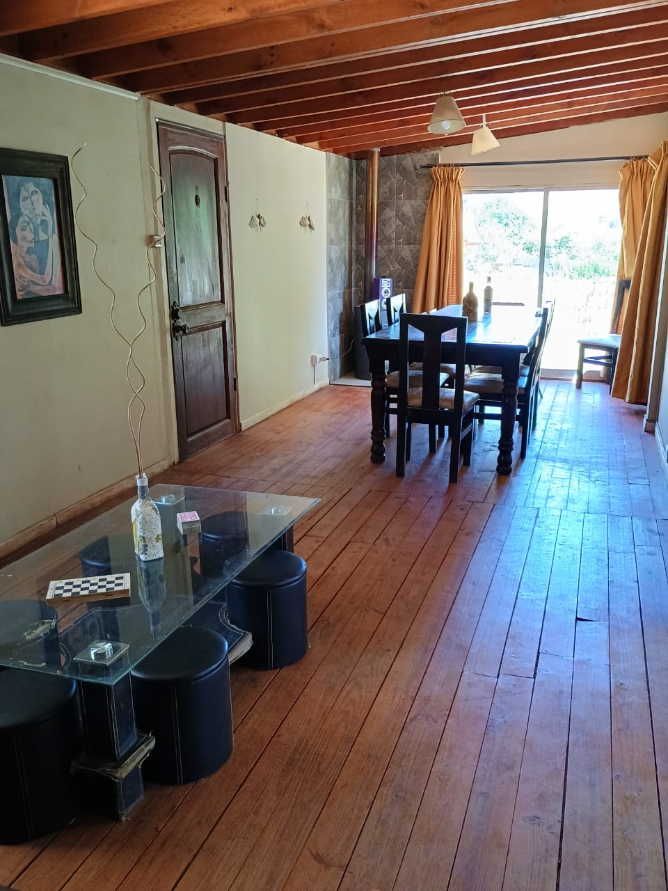 Cuenta con áreas verdes y amplio estacionamiento. La cabaña en su interior cuenta con tres habitaciones, en una habitación hay dos literas y en otra habitación hay una litera con una cama nido. En la habitación principal está la cama matrimonial con la cama americana de plaza y media extra cocina, un baño livin con comedor amplio y una bosca para invierno.