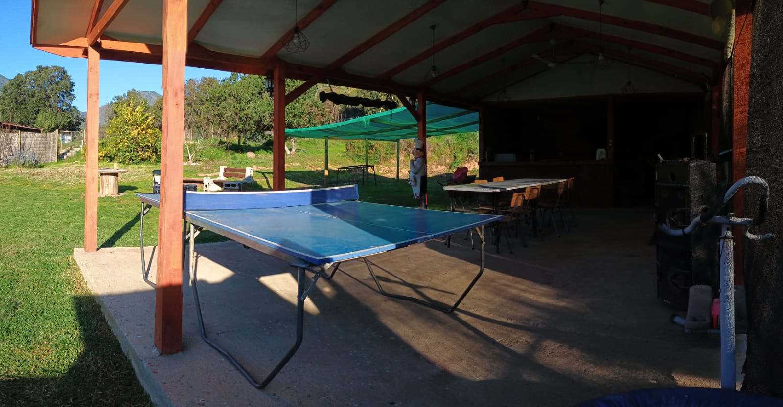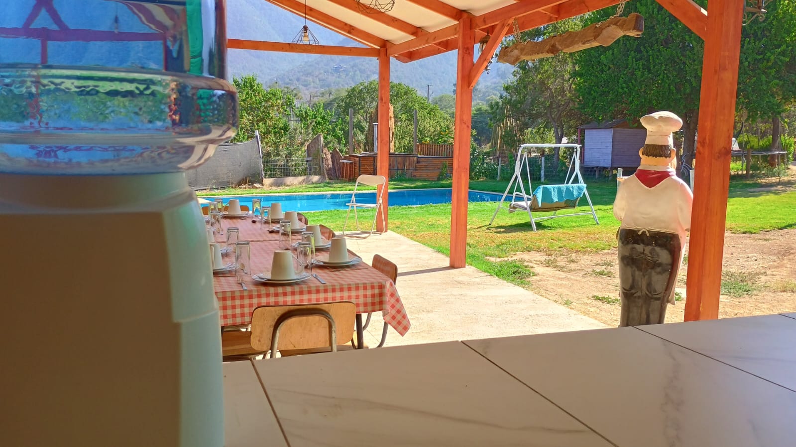 Cabaña que está equipada para 8 personas pero con capacidad para un máximo de 12 personas, con una terraza donde se encuentra una parrilla para hacer asado y mesa para compartir en familia una piscina de 10 * 5 de 80 cm lo más bajo y 175 cm lo más hondo.